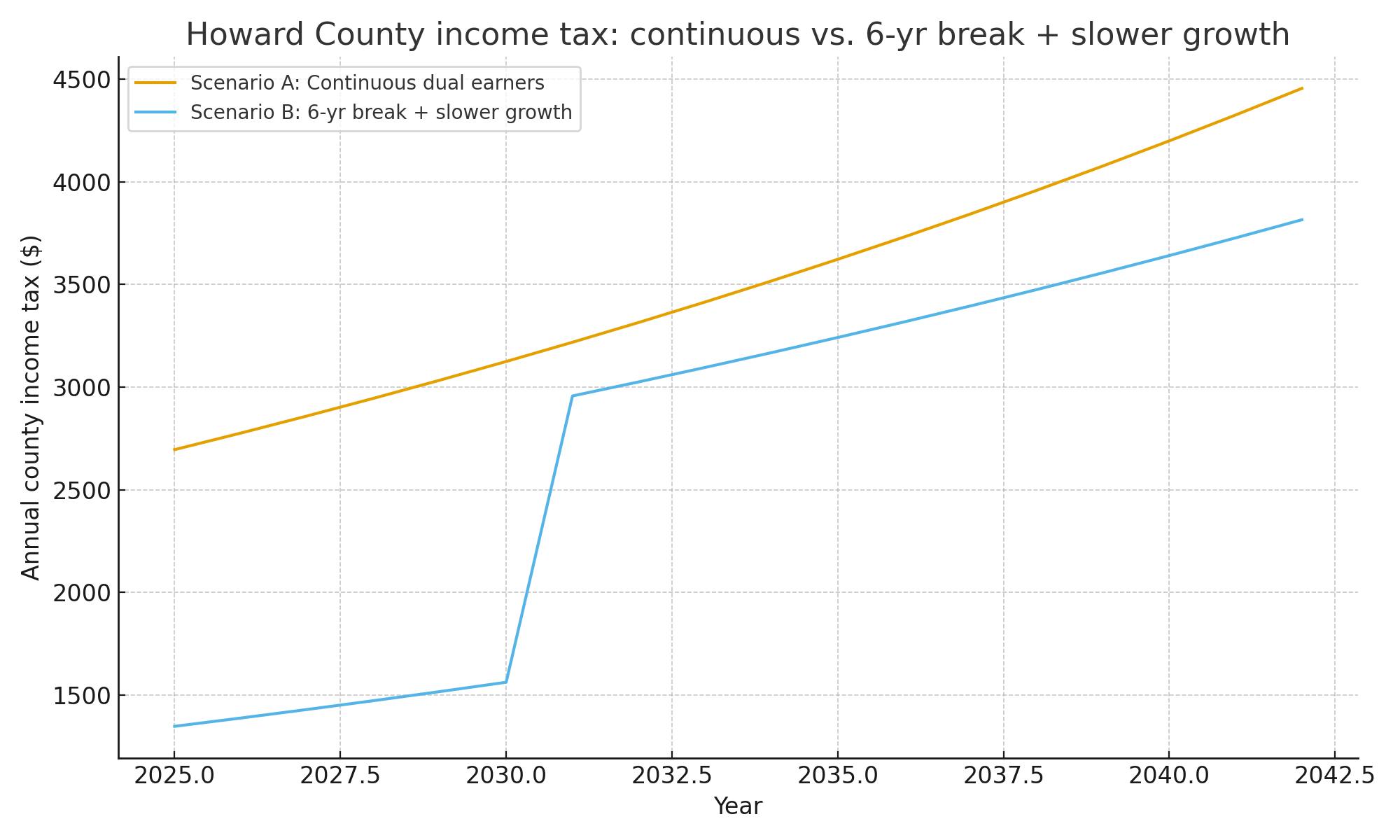 Take a look at the difference in total County revenues collected from FAMILY A where two earners at 300% FPL work without interruption for 18 years with an annual 3% wage growth, and FAMILY B where one parent exits the workforce for 6 years to raise two children. The exiting parent only receives a 1.5% annual bump in pay due to the “Motherhood Penalty.”