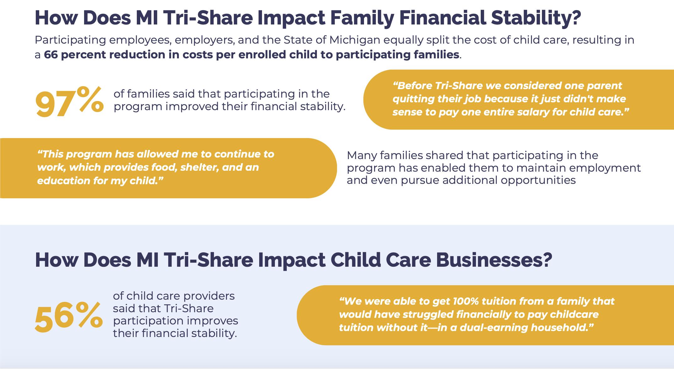 In 2024, Michigan commissioned a review of the program. Key takeaways include a 99% satisfaction rate among participating families. More than 71% of participating employees report that the program has improved employment retention. And nearly 65% of participating employers reported that they believed they were more competitive against other employers because they were able to offer the Tri-Share benefit. See excerpts below from the 2024 evaluation report: