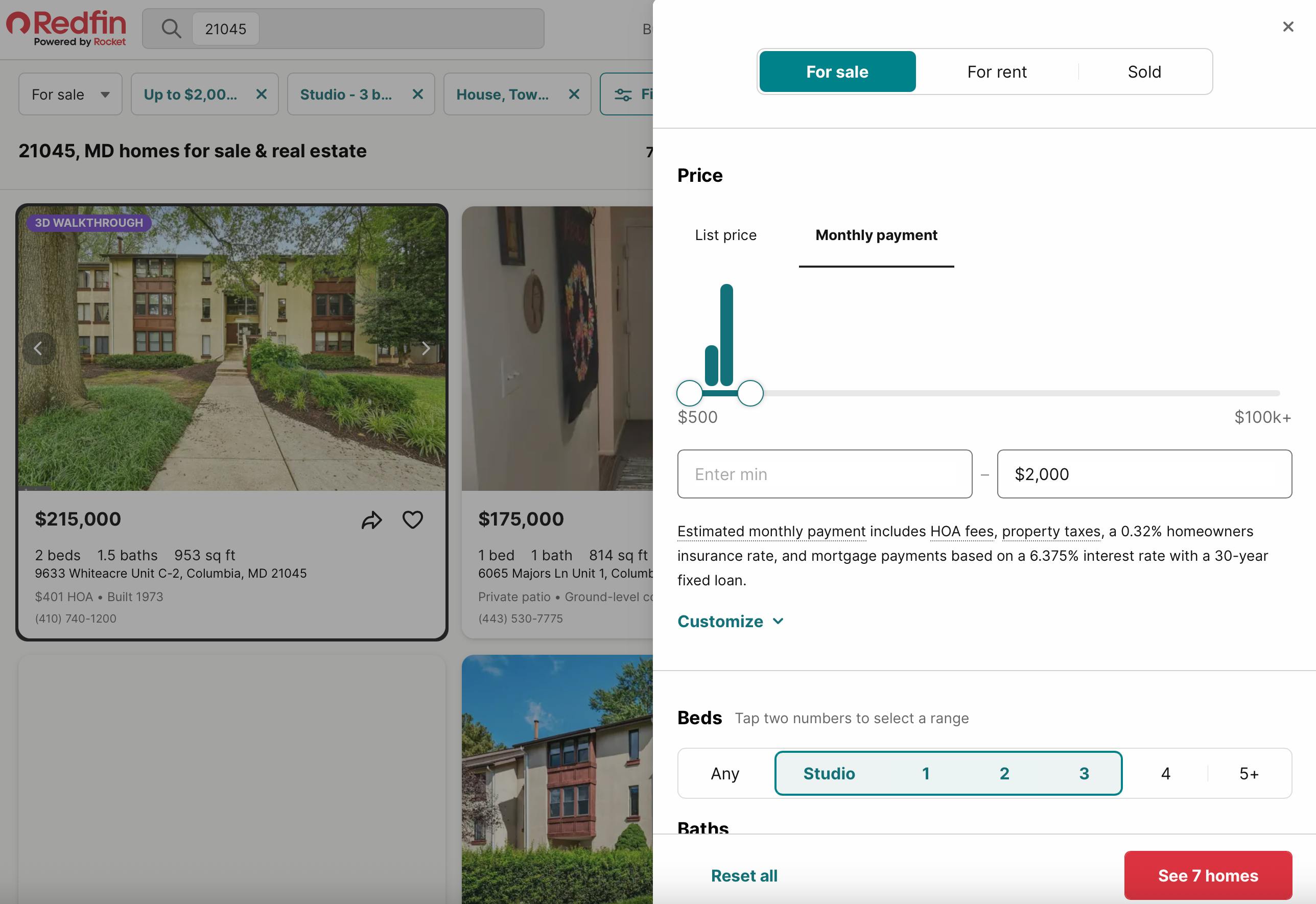As of this writing (October 2025) just seven properties are listed on Redfin.com for sale with an estimated average monthly payment of $2,000 or less (30-yr fixed with a 20% downpayment) in the 20145 zipcode.
